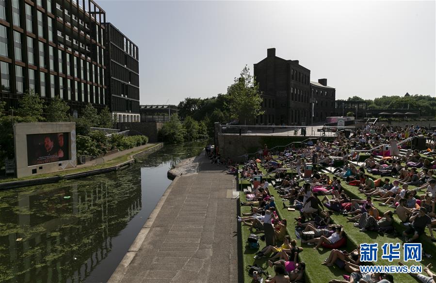 6月29日,在英国伦敦,人们坐在河边观看露天电影。新华社记者韩岩摄