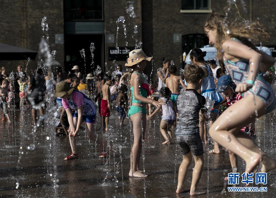 6月29日,在英国伦敦,孩子们在广场喷泉戏水纳凉。新华社记者韩岩摄