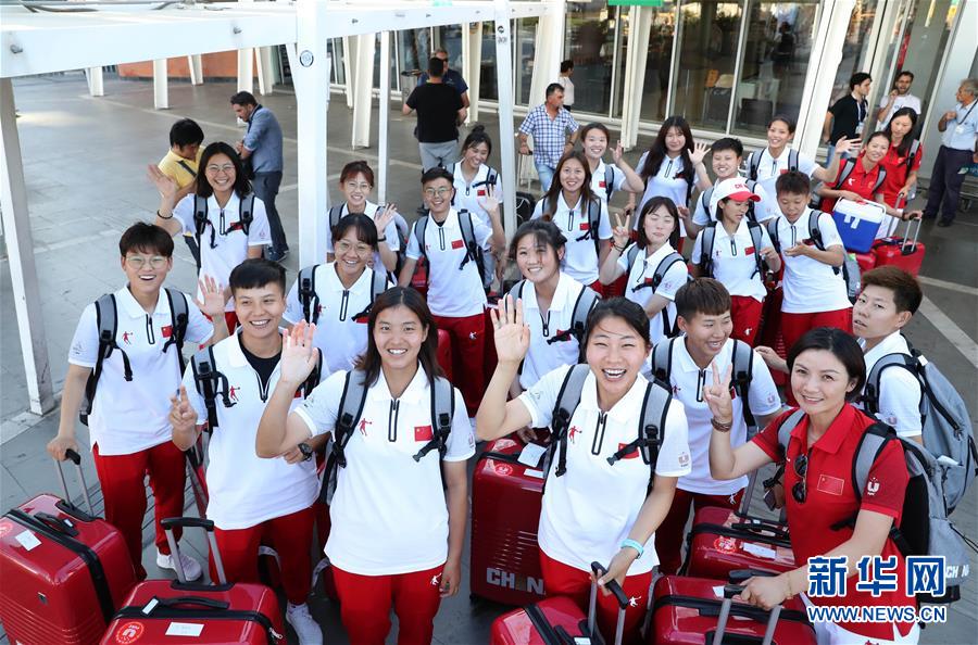 6月29日,中国大学生体育代表团女子足球项目成员在机场合影。
