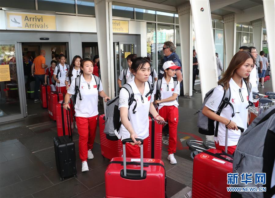 6月29日,中国大学生体育代表团成员走出机场。新华社记者孟永民摄