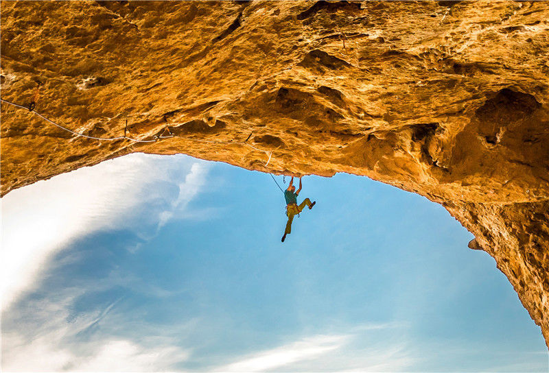 当地时间2018年3月22日,西班牙加泰罗尼亚,37岁的克里斯·夏尔马克服重力,爬上一个山洞的最高点。SWNS/视觉中国