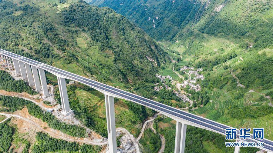 这是威宁彝族回族苗族自治县中石公路姜家沟大桥(6月26日无人机拍摄)。 6月30日,威宁彝族回族苗族自治县中水至黑土河至石门高等级公路通车试运行。据介绍,中石公路起于六威高速中水互通,止于石门乡集镇,总长度33.447公里,设计时速60公里。 石门乡地处滇黔交界,是贵州省内偏远的乡镇,也是贵州省20个极贫乡镇之一。中石公路通车后,将串联起中水、黑土河、石门三个乡镇,助力大山深处群众脱贫增收。 新华社记者 陶亮 摄