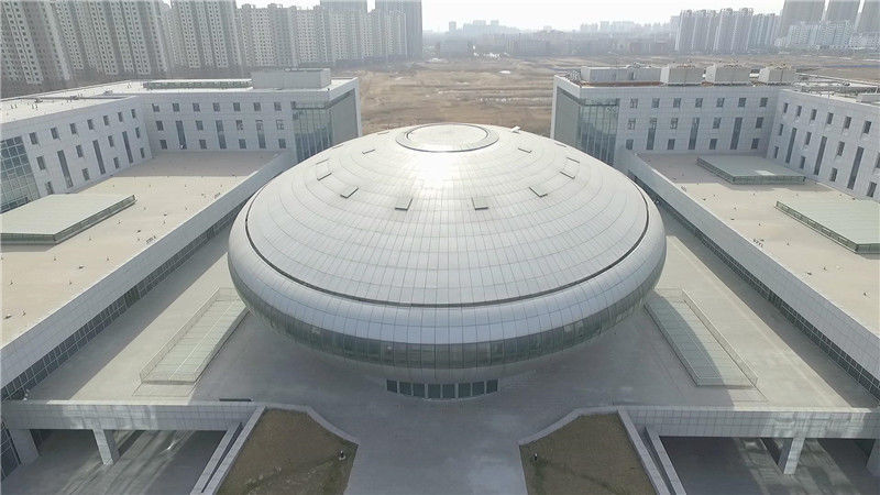 2016年1月12日,山东滨州,摄影师使用航拍器航拍了滨城区科技馆。总建筑面积为8283㎡的科技馆主体工程业已完工,整体呈飞碟状的建筑外观成为一大特色。