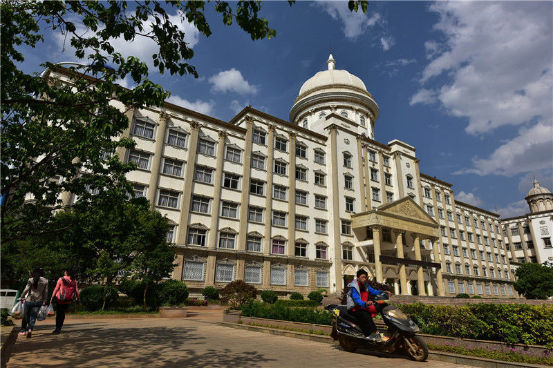 2015年4月9日,云南昆明,学生们从高校的主楼前经过。