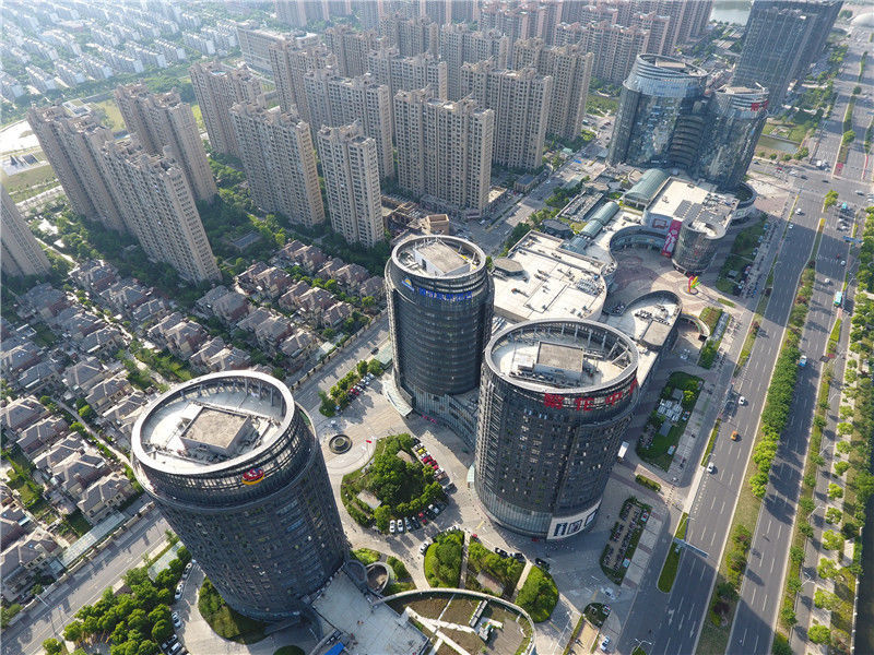 2017年5月10日,江苏苏州,相城区一商业广场5幢七八十米高的写字楼呈短粗的圆筒状,外形酷似五个“啤酒桶”,被网友调侃为“酒桶楼”。