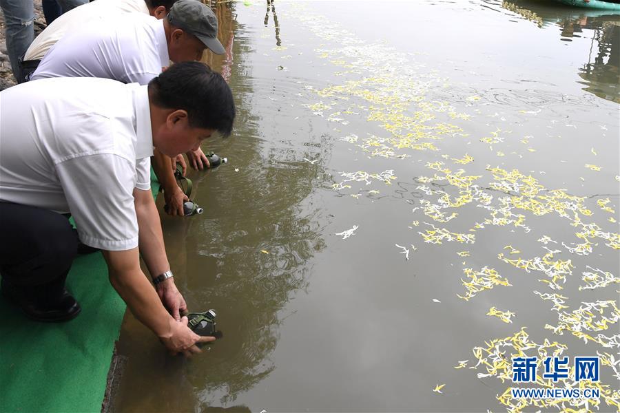 7月1日,福建籍红军后人在广西兴安县界首镇湘江江边盛装湘江水准备带回福建老家。 新华社记者 周华 摄