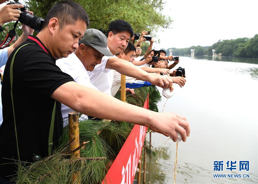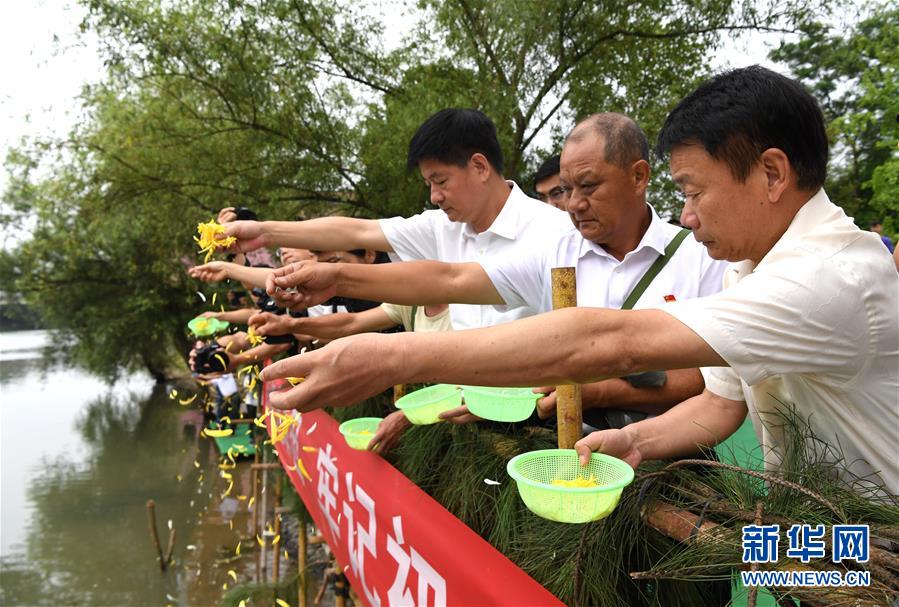 7月1日,福建籍红军后人在广西兴安县界首镇湘江江边撒花祭奠红军烈士。新华社记者 周华 摄