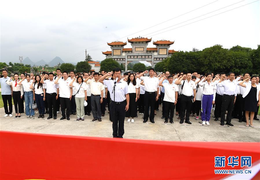 7月1日,再走长征路的记者团、红军后人的代表及当地党员干部在广西兴安县红军长征突破湘江烈士纪念碑园一起重温入党誓词。 新华社记者 周华 摄