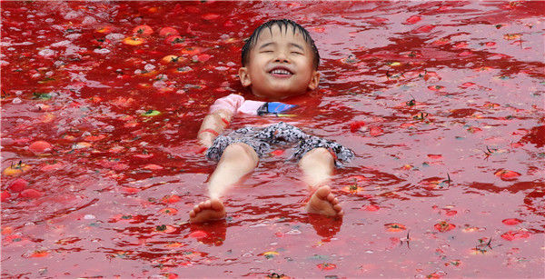 当地时间2013年6月23日,韩国京畿光州,孩子在番茄泳池中玩耍。