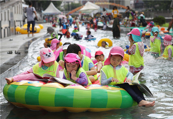当地时间2018年7月24日,韩国首尔市松坡区城内川边,小朋友们在泡脚读书。近日首尔连日高温,松坡区政府在城内川水上乐园开设书吧,让孩子们戏水读书两不误。
