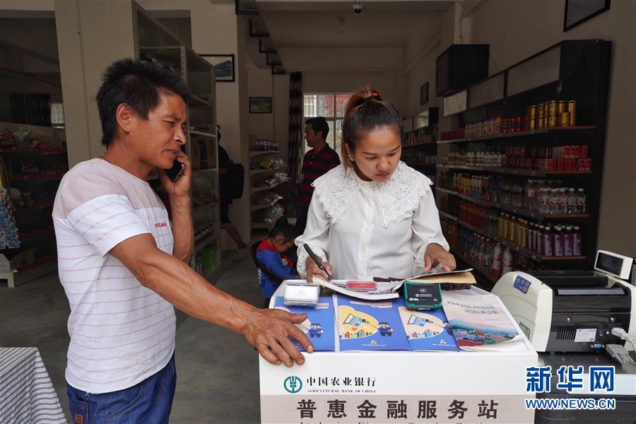 在大兴地镇维拉坝“珠海小区”金融服务站,姬红花(右)帮助村民提取现金(6月24日摄)。新华社记者 秦晴 摄