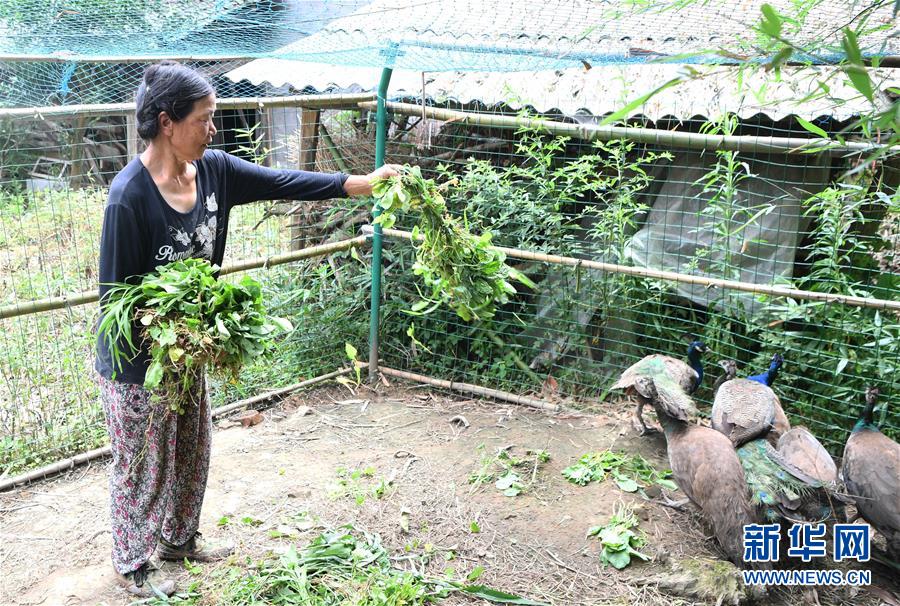 7月2日,重庆忠县马灌镇双石村村民谭云兰在给自己养的蓝孔雀喂食。