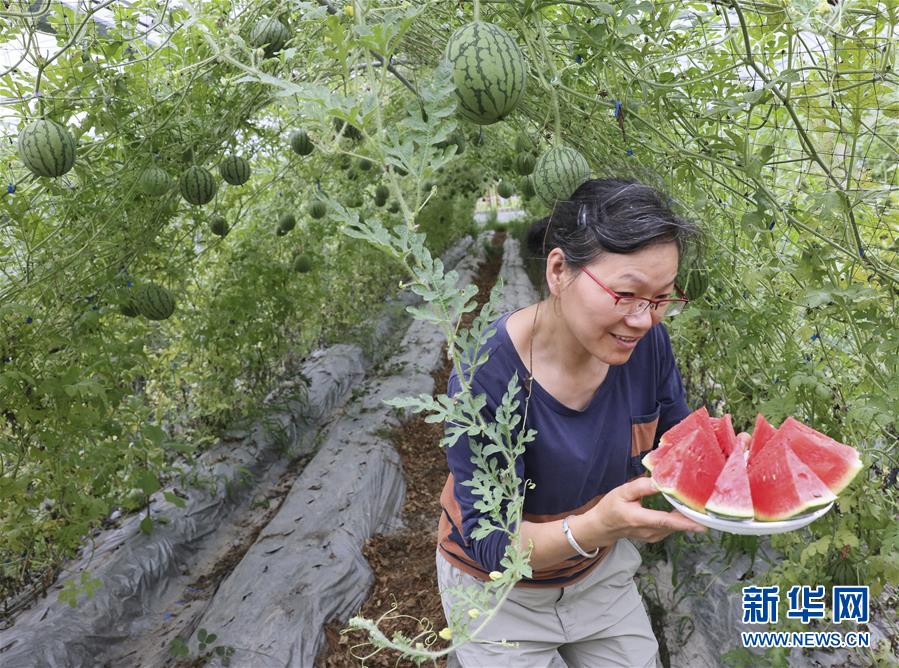 7月2日,浙江省湖州市德清县新田农庄的工作人员请游客品尝空中西瓜。 新华社记者兰红光摄