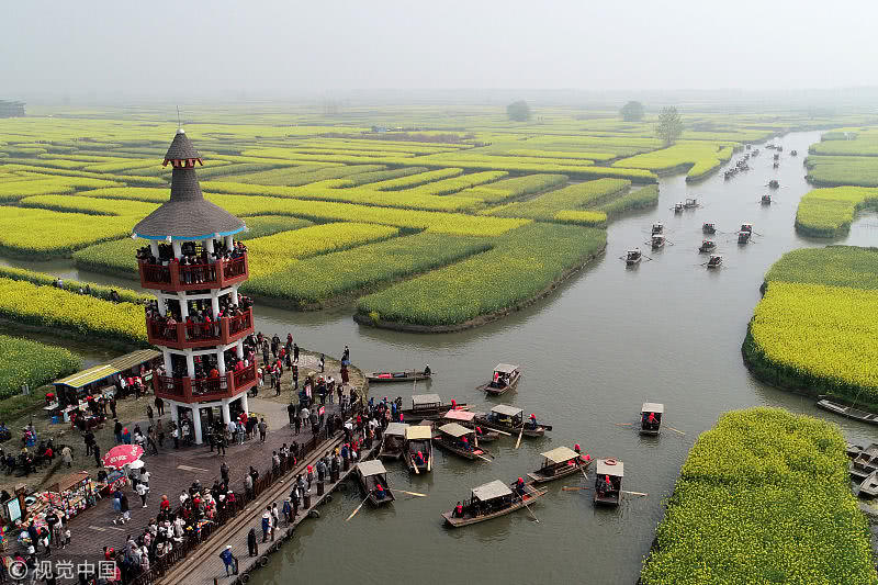 2019年4月7日,江苏省兴化市千垛菜花景区迎来旅游高峰期,数万游客前来欣赏盛开的油菜花,乐享假日好时光。