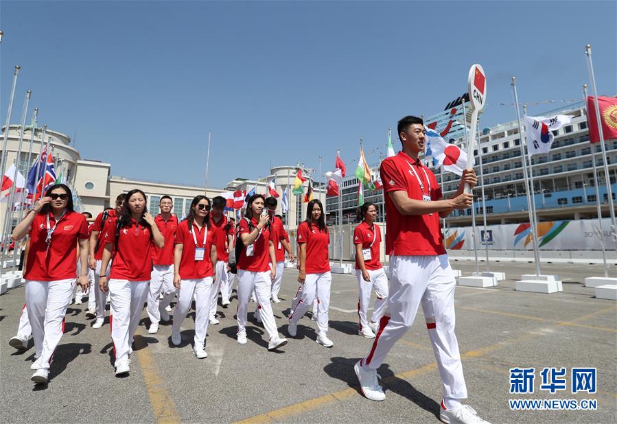 7月3日,中国大学生体育代表团成员代表步入升旗广场。 新华社记者 孟永民 摄
