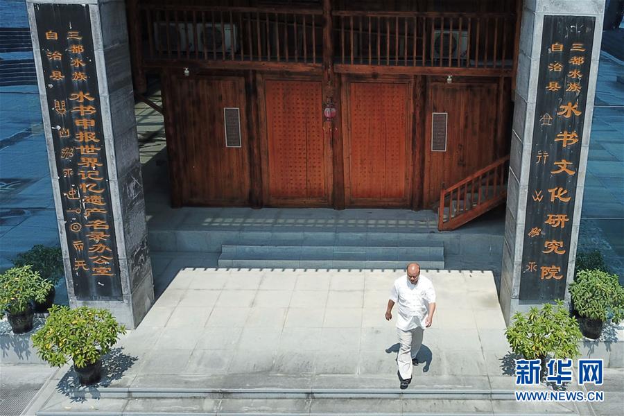 7月3日,三都县水书文化研究院的工作人员韦仕钊从三都水书文化研究院内走出(无人机拍摄)。