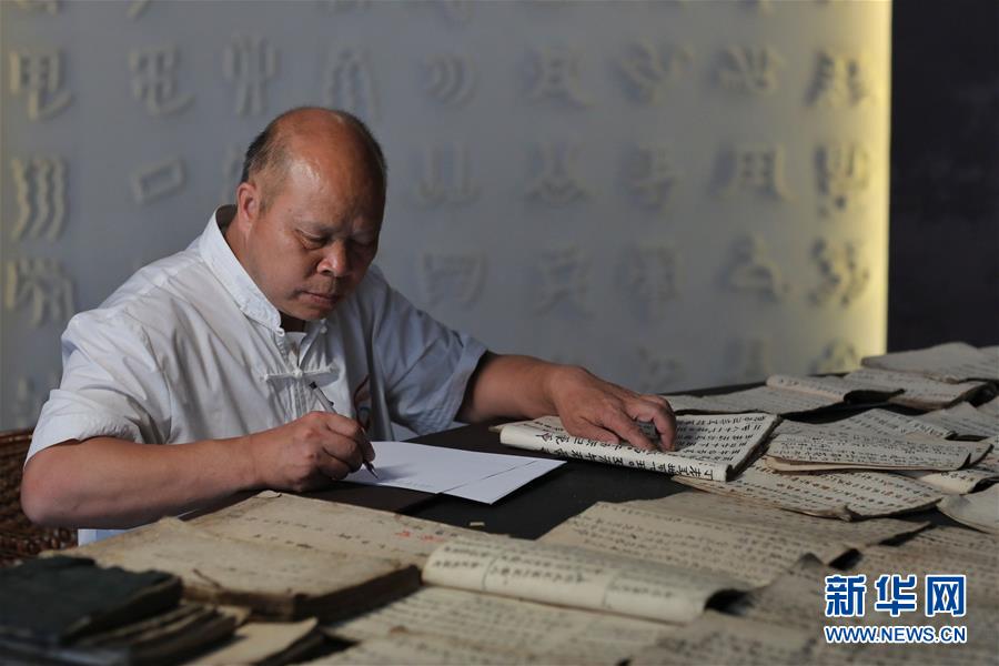 7月3日,三都县水书文化研究院的工作人员韦仕钊在整理水书文本。 新华社记者 欧东衢 摄