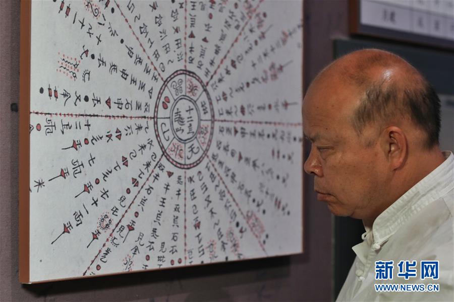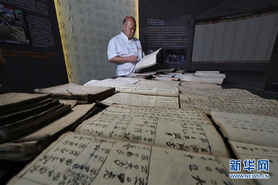 7月3日,三都县水书文化研究院的工作人员韦仕钊在观看水族文化博物馆内的水书展板。 新华社记者 欧东衢 摄