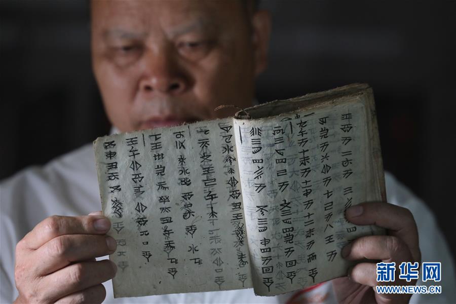 7月3日,三都县水书文化研究院的工作人员韦仕钊在阅读水书文本。 新华社记者 欧东衢 摄