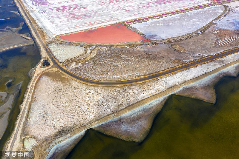 这片俯拍的盐田总面积达3500公顷(35平方千米),因为当地海藻和盐的浓度不同造成了盐田的不同色彩。