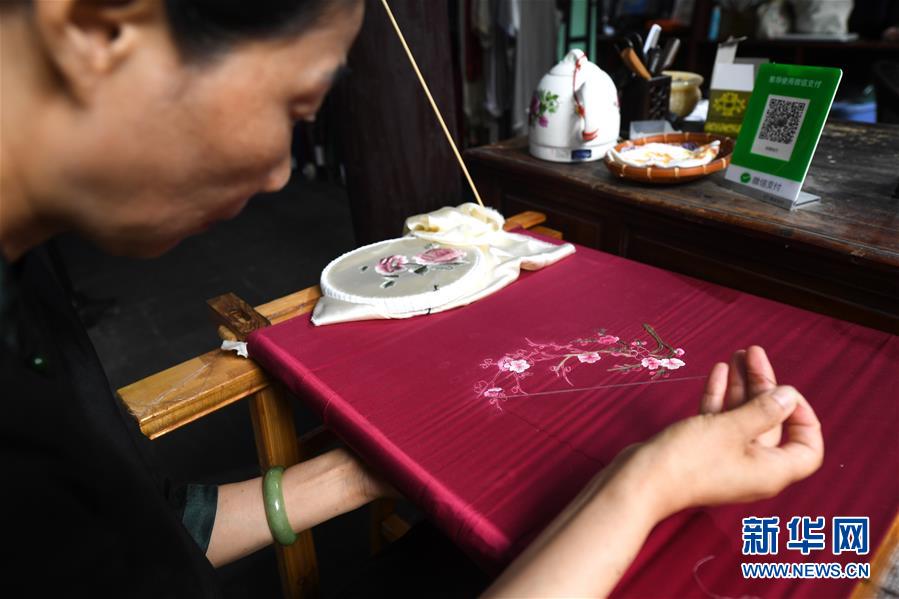 7月4日,一名绣娘在新市古镇一个店铺内刺绣。 新华社记者 张笑宇 摄