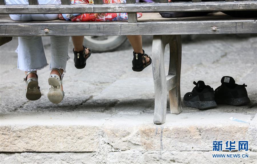7月4日,游客经过新市古镇一座石桥。 新华社记者 张玉薇 摄