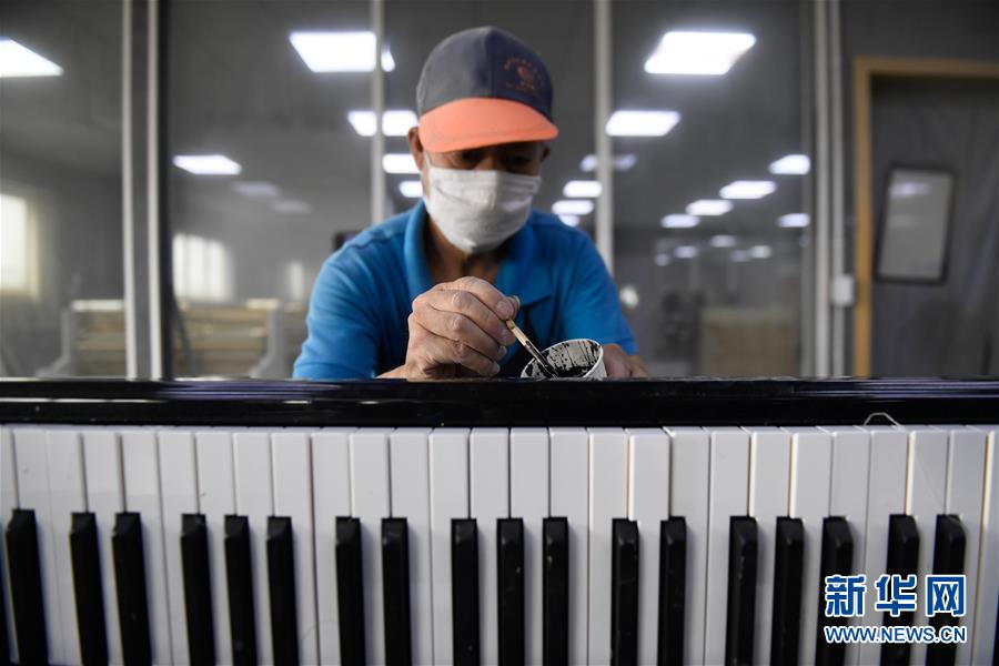 7月4日,在德清县洛舍镇一家钢琴企业,工人为钢琴补漆。 新华社记者 黄宗治 摄