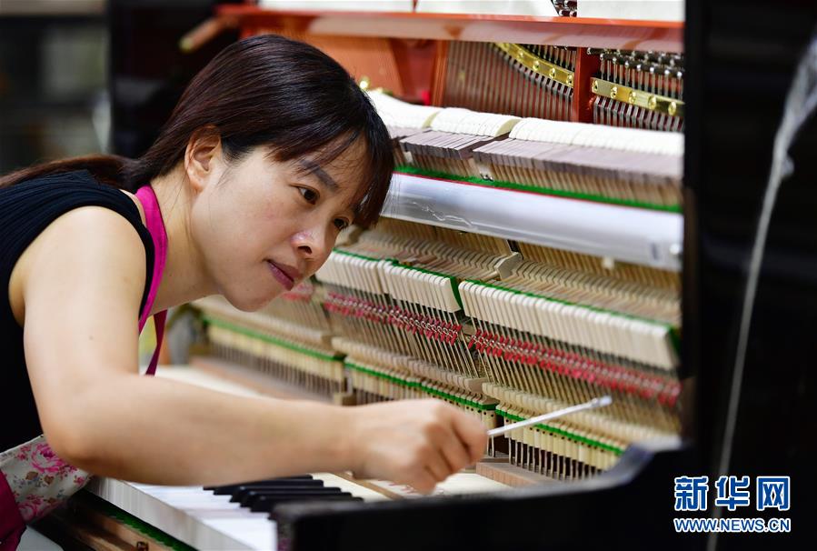 7月4日,在德清县洛舍镇的一家钢琴企业,工人朱昌莲在调试钢琴音色。 新华社记者 魏培全 摄