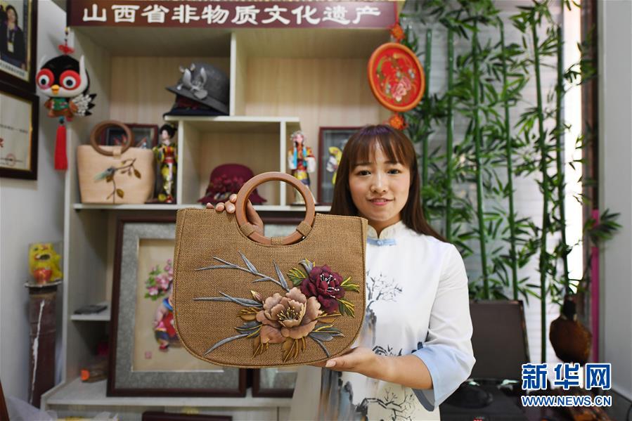 7月4日,在位于交城县天宁镇的展厅内,张姣丽展示其设计的堆绫包饰。新华社记者 杨晨光 摄
