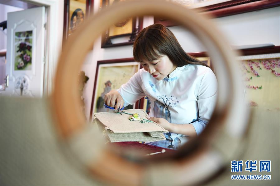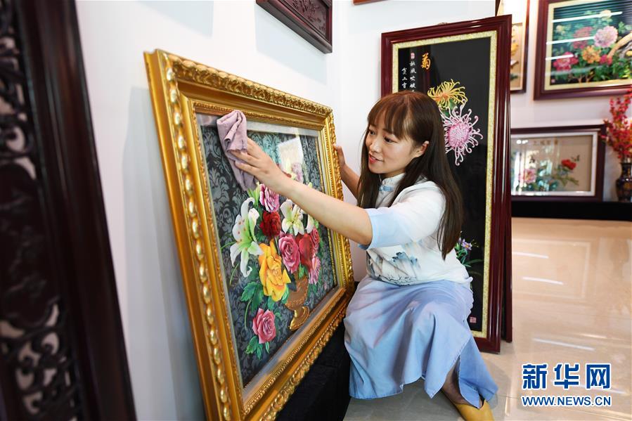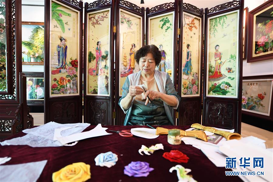 7月4日,在位于交城县天宁镇的展厅内,张姣丽在制作堆绫工艺品。 新华社记者 杨晨光 摄