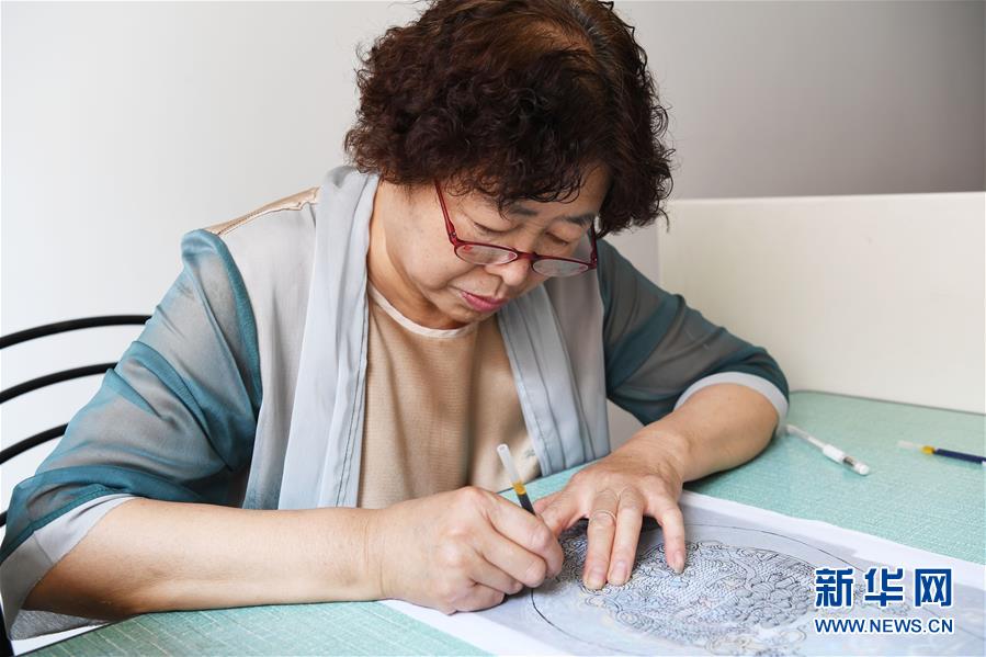 7月4日,在位于交城县天宁镇的工作室内,解爱英在临摹图稿。新华社记者 杨晨光 摄