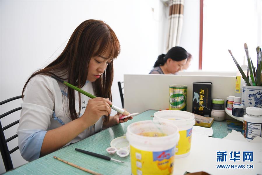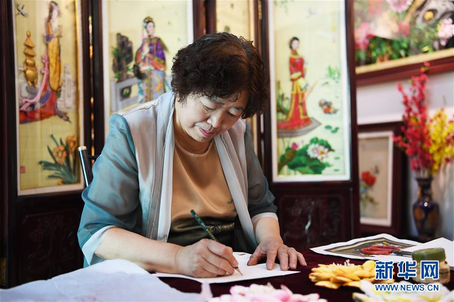 7月4日,解爱英在位于交城县天宁镇的展厅内绘制图稿。 新华社记者 杨晨光 摄