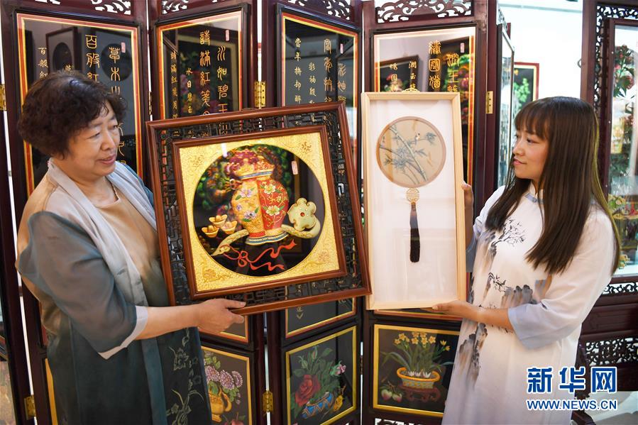 7月4日,在位于交城县天宁镇的展厅内,解爱英和女儿张姣丽(右)在展示各自的作品。 新华社记者 杨晨光 摄