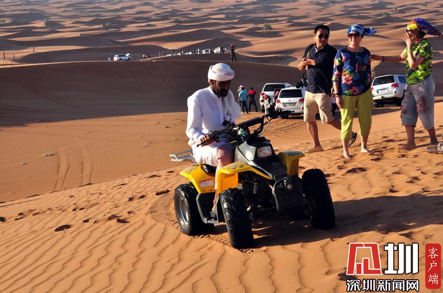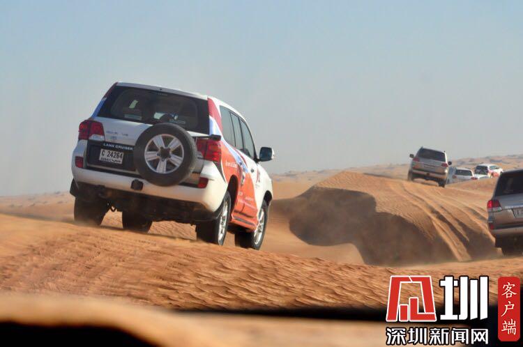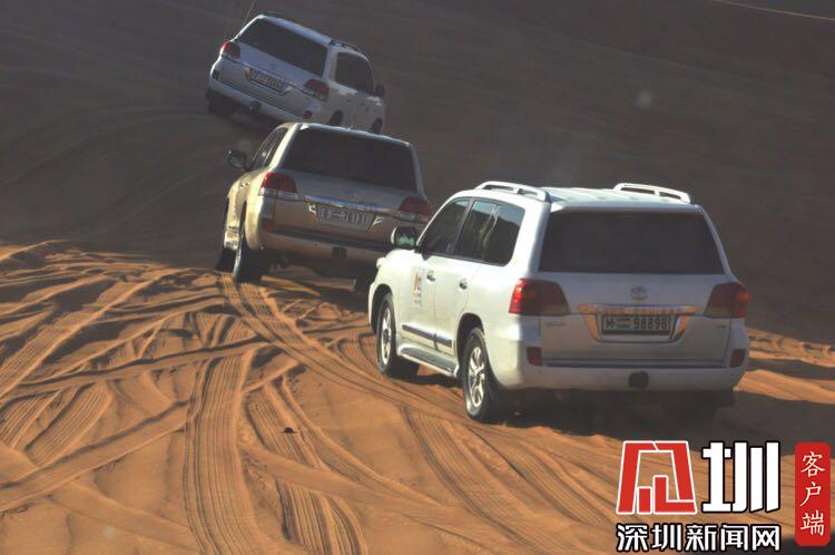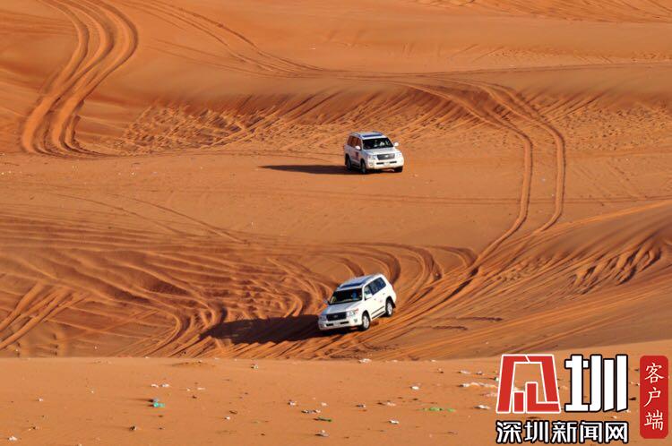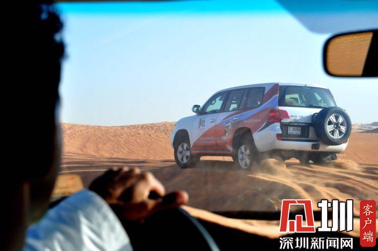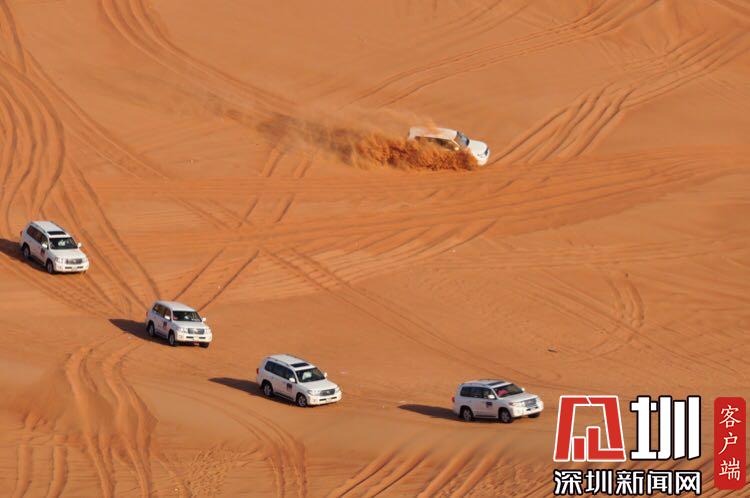 去迪拜,一个最不可错过的体验项目就是"冲沙"。所谓冲沙,就是高速的车在沙丘里不断爬坡、俯冲、腾飞、落下等等一系列惊险的动作。李仁奇摄