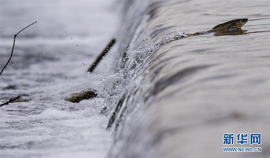 7月6日,在青海省刚察县沙柳河里,一只湟鱼跃起向上洄游。 新华社记者 刘金海摄