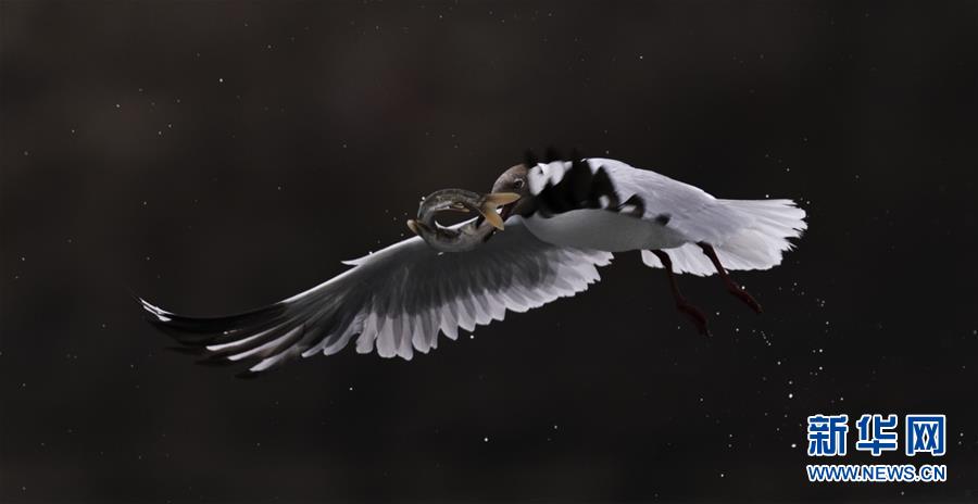 7月6日,在青海省刚察县沙柳河,一只棕头鸥捕捉到一只湟鱼后飞离水面。 新华社记者 费茂华摄