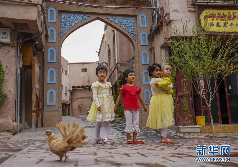 7月7日,小朋友在雨中的喀什古城景区玩耍。 新华社记者 赵戈 摄