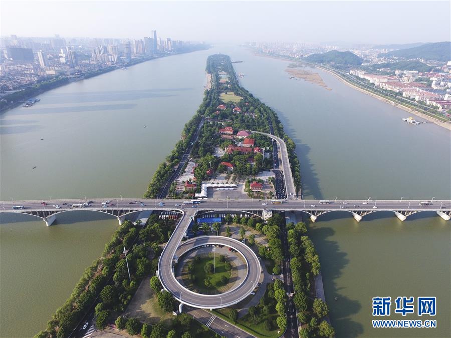 俯瞰湖南长沙橘子洲大桥和桥下的橘子洲景区(2017年7月15日无人机拍摄)。 新华社记者 龙弘涛 摄