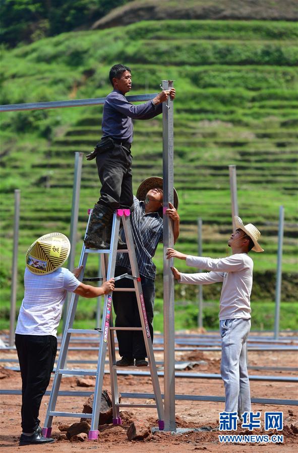 在党鸠村木耳种植基地,村民和驻村扶贫工作队员在搭建大棚(6月2日摄)。 新华社记者 黄孝邦 摄