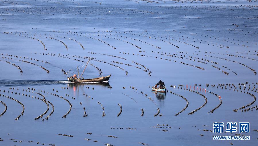 这是11月4日无人机拍摄的霞浦县三沙镇的紫菜种植区。 近日,福建省霞浦县沿海6万亩紫菜迎来收获季节,渔民们出海收获紫菜,海上田园一派繁忙丰收景象。 新华社记者 姜克红 摄