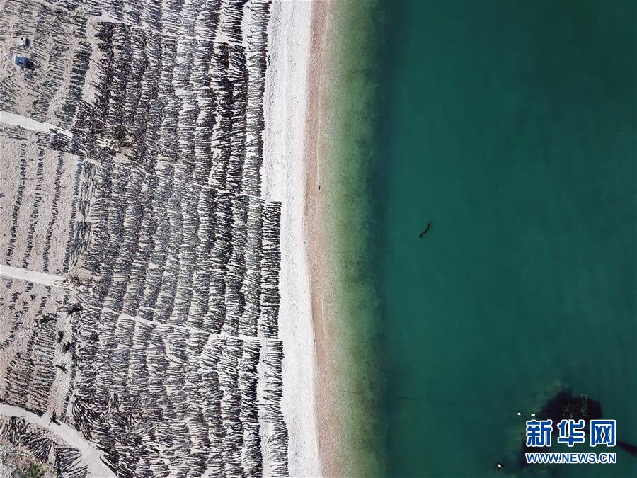 这是大钦岛乡东村海滩晾晒的海带(5月23日无人机拍摄)。新华社记者 朱峥 摄