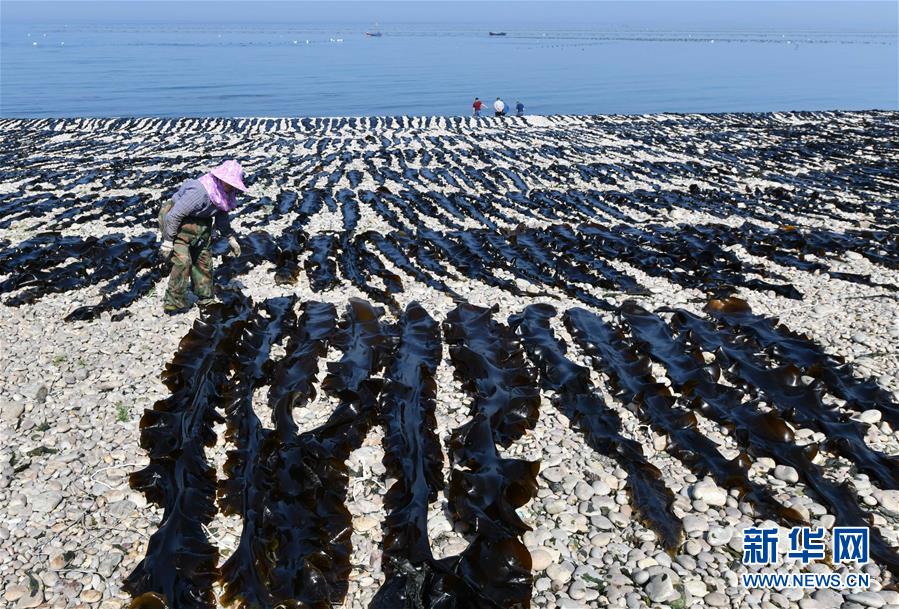 海岛居民在大钦岛乡东村的海滩上晾晒海带(5月23日摄)。 新华社记者 朱峥 摄