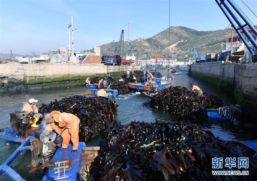 大钦岛乡东村码头挤满了正在卸载的收割船(5月24日摄)。新华社记者 朱峥 摄