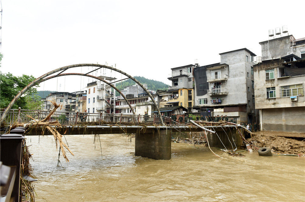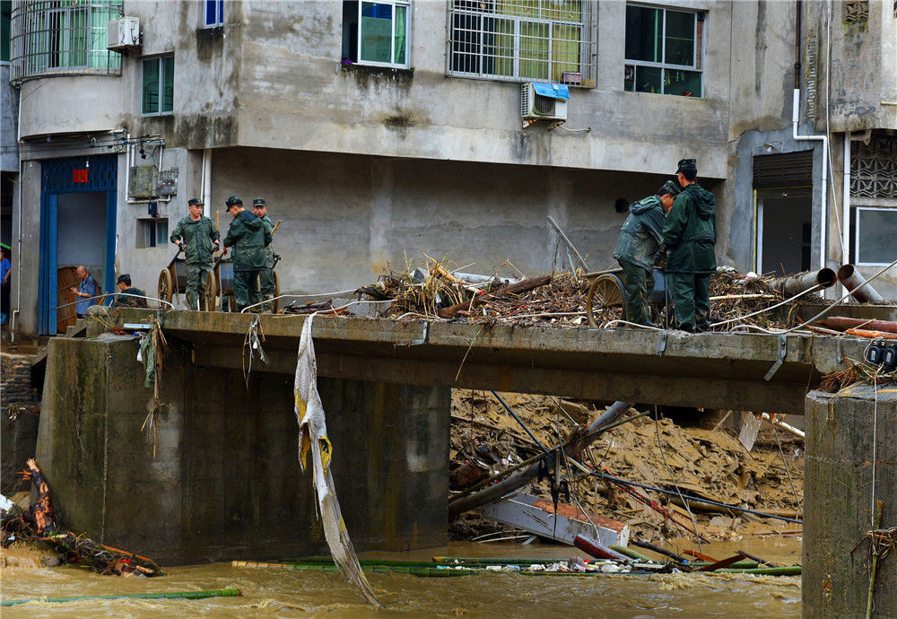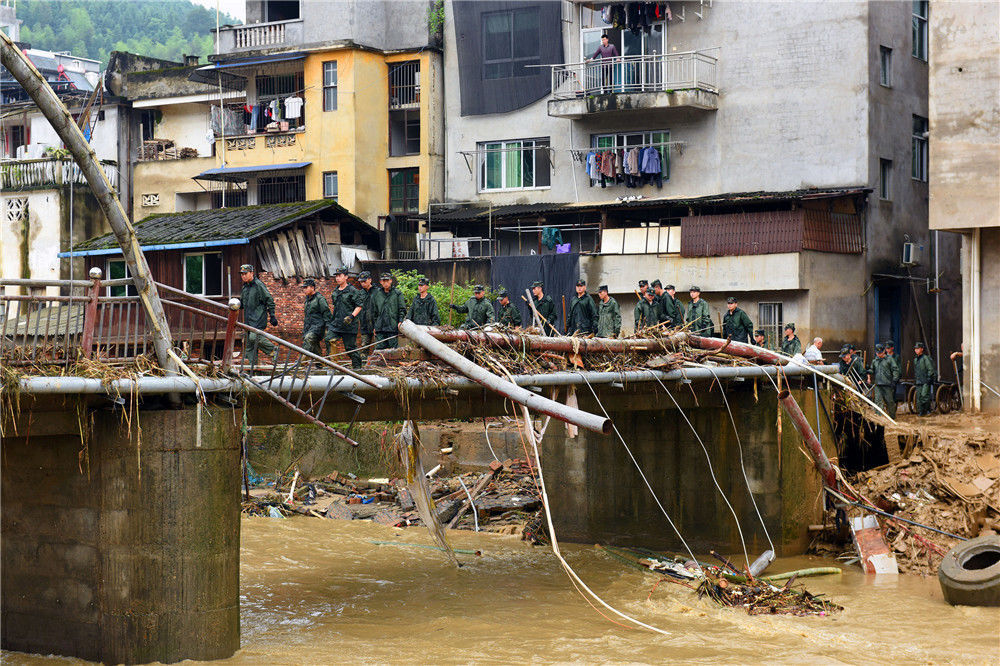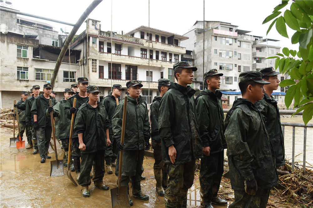2019年7月9日,在福建省南平市顺昌县仁寿镇,武警官兵在一线支援。