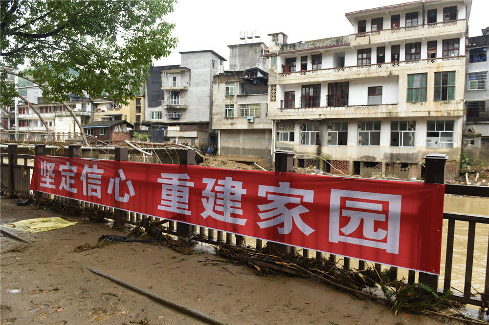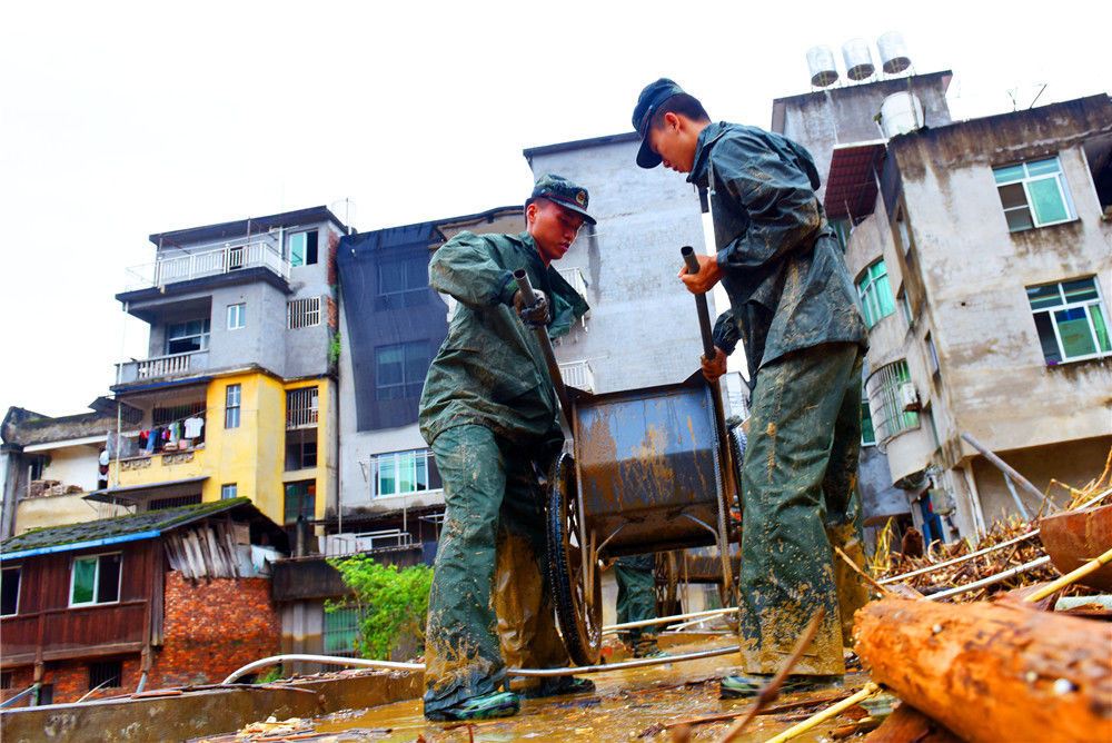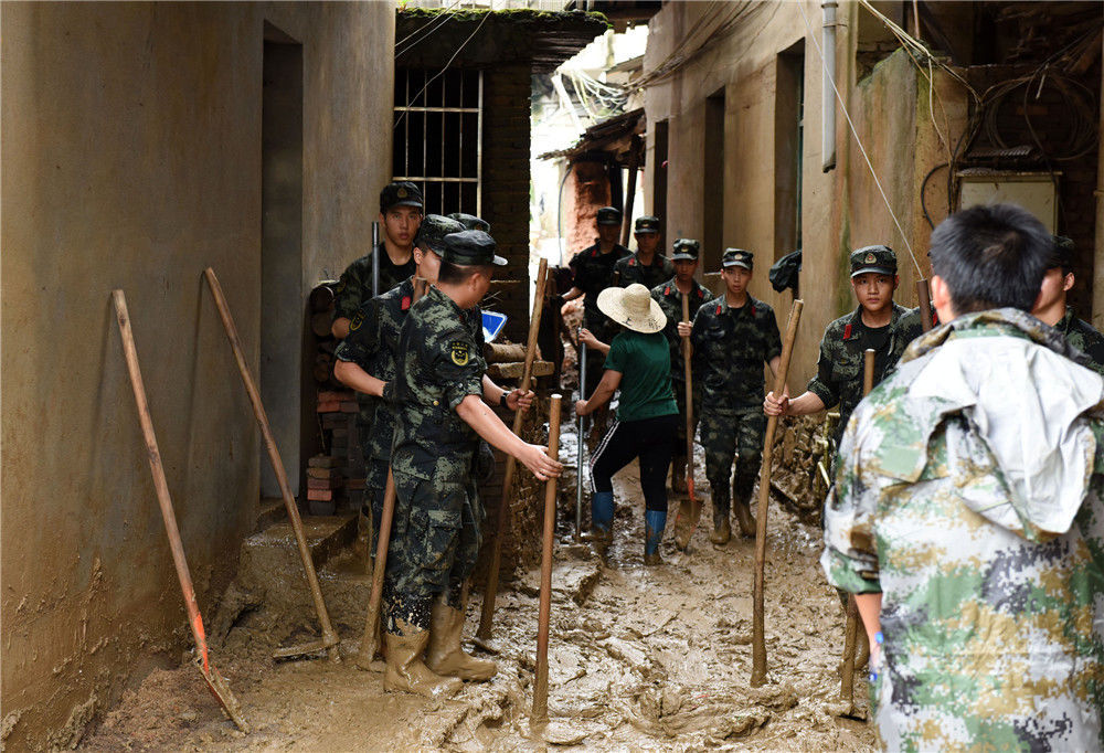 2019年7月9日,在福建省南平市顺昌县仁寿镇,武警官兵和村民一同清淤。