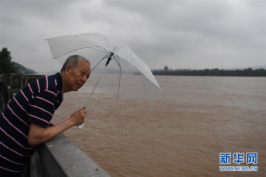 7月9日,一名市民在湘江边查看涨水情况。新华社记者 薛宇舸 摄