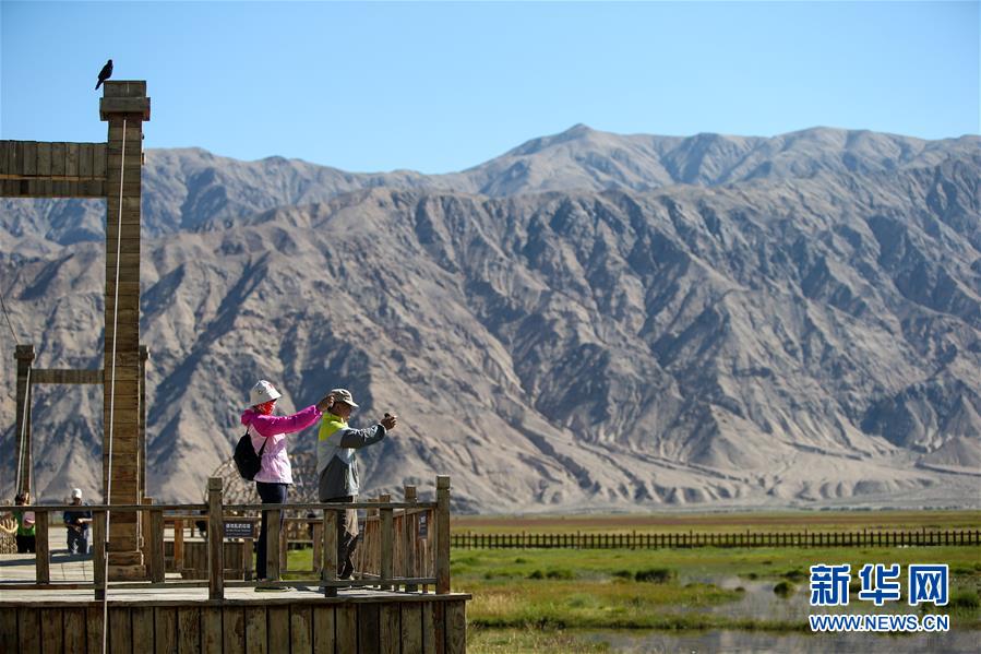 7月9日,游客在新疆塔什库尔干塔吉克自治县帕米尔高原阿拉尔国家湿地公园拍照。 新华社记者 李京 摄