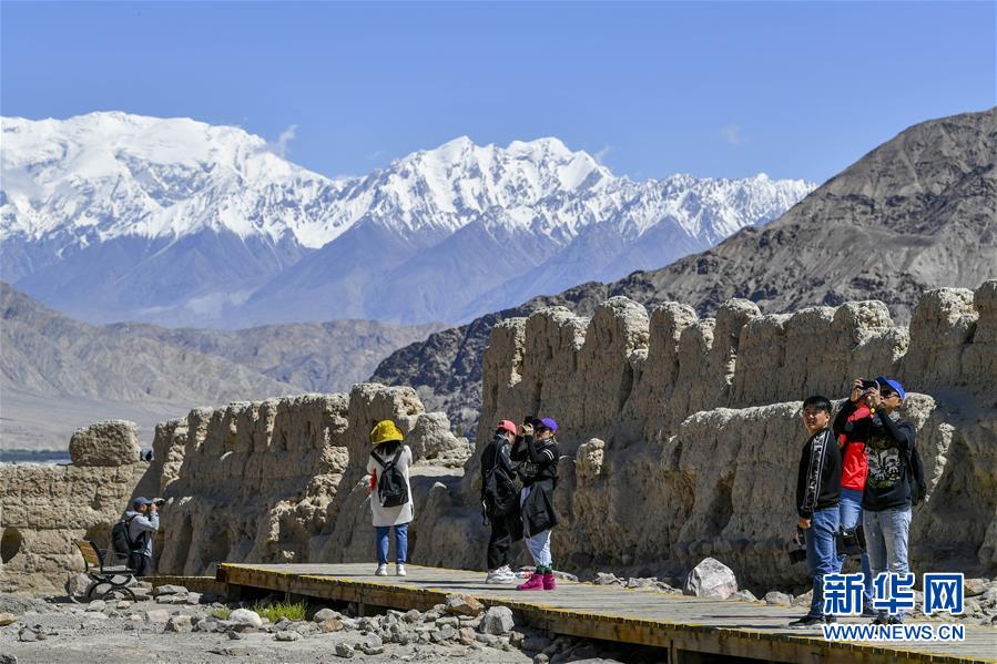 7月9日,游客在新疆塔什库尔干石头城遗址游玩。 新华社记者 胡虎虎 摄