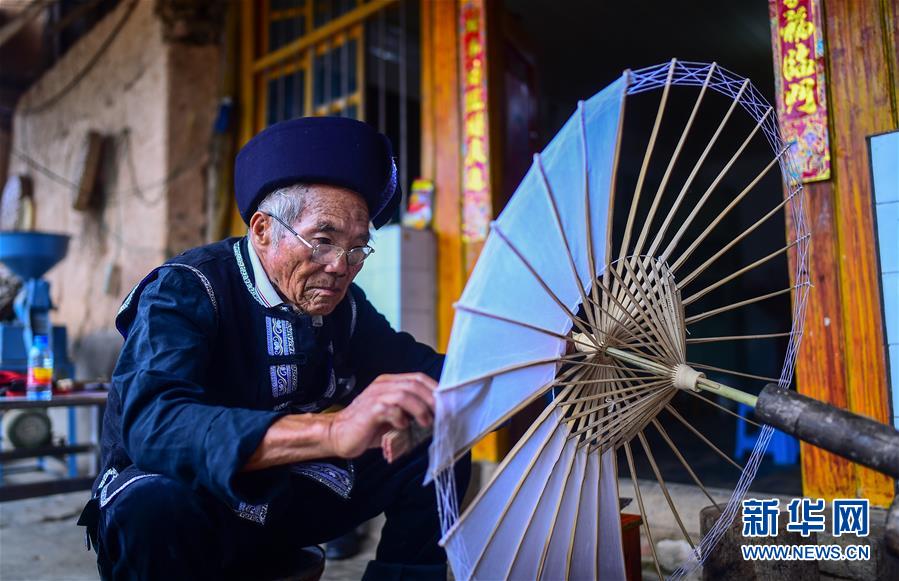 张荣华老人在家中小院里制作水竹花伞(7月9日摄)。 新华社记者江文耀摄