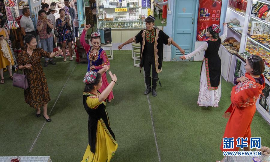 游客在喀什古城景区阿热亚路“古丽的家”特色庭院里欣赏民族歌舞(7月9日摄)。 新华社记者 赵戈 摄